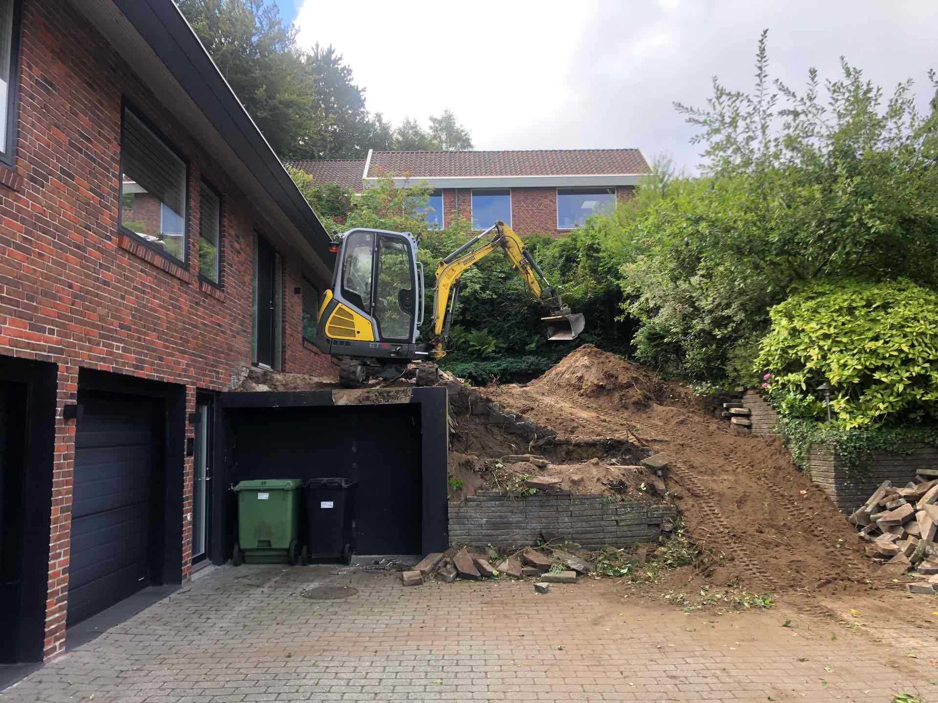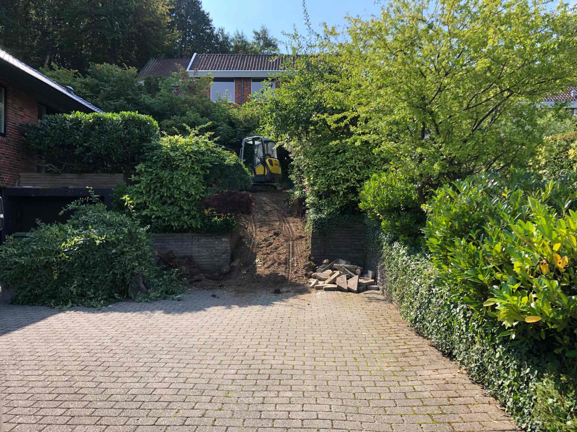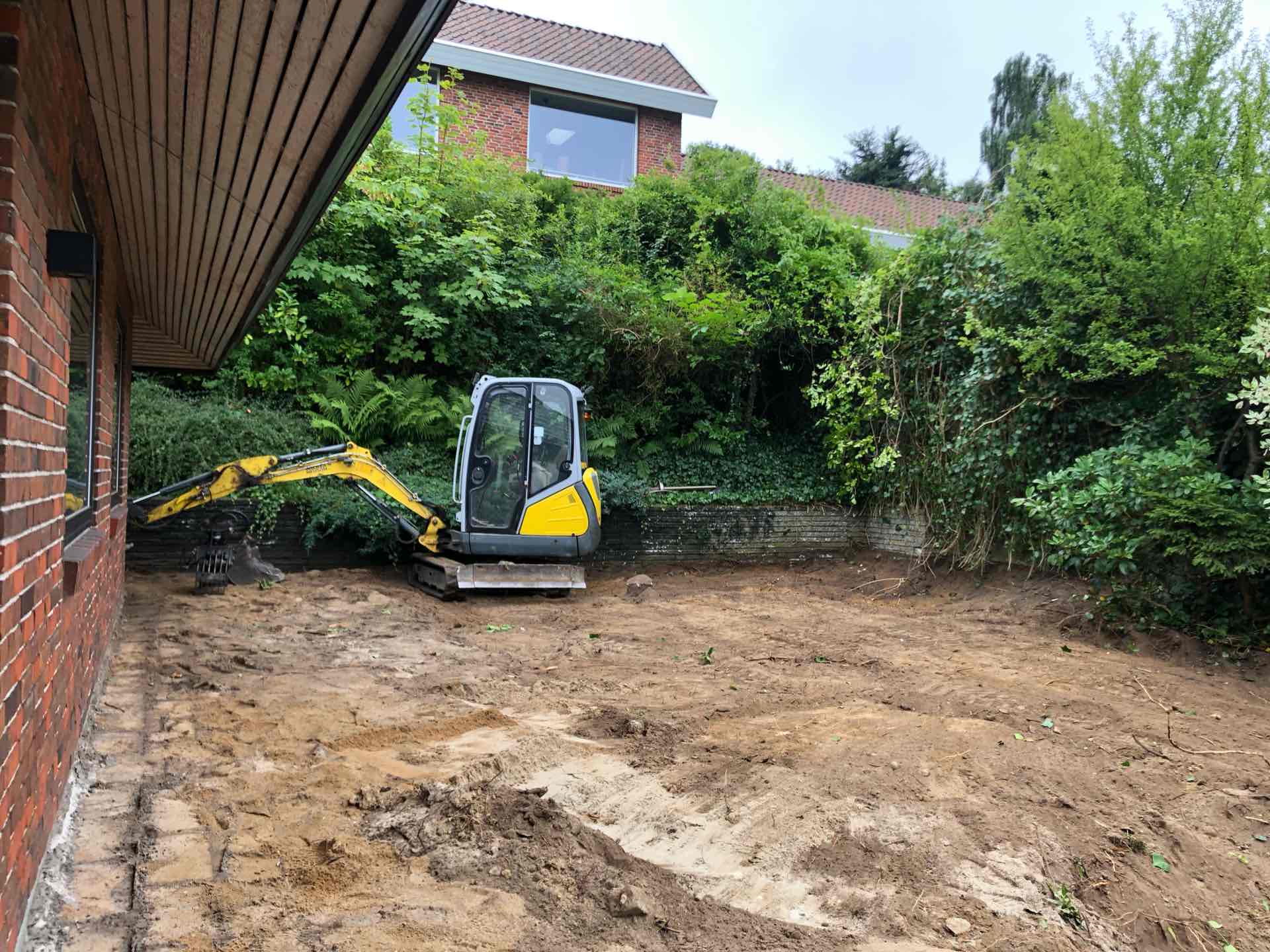 Haven blev ryddet for træer og buske, gamle støttemure og belægninger fjernet, så opbygning af nye støttemure, nye trappeforløb og ny belægning kunne gå i gang.