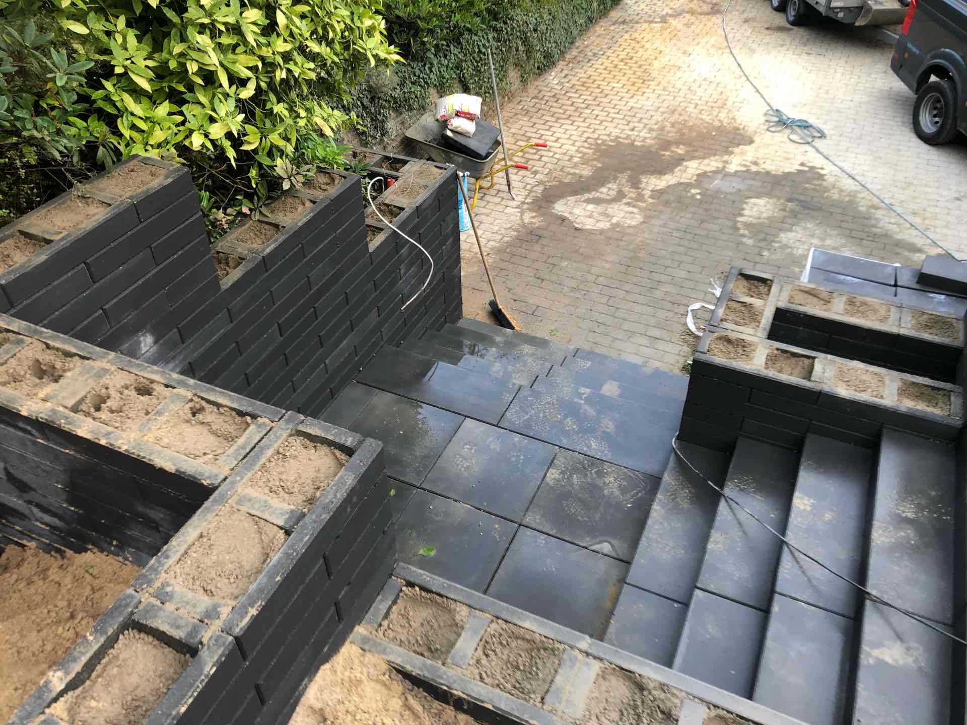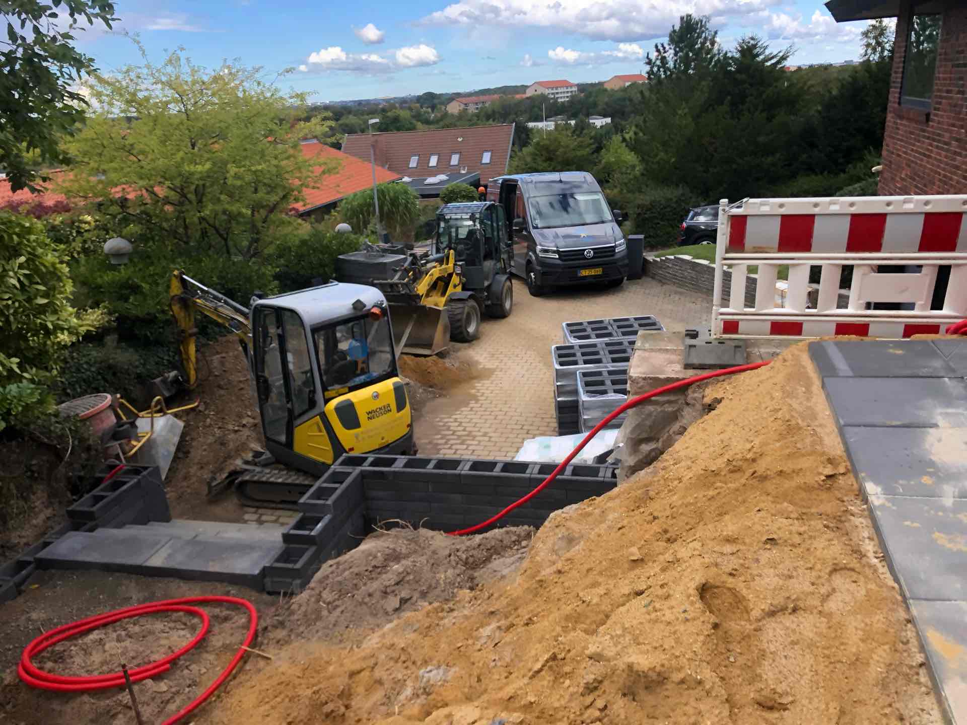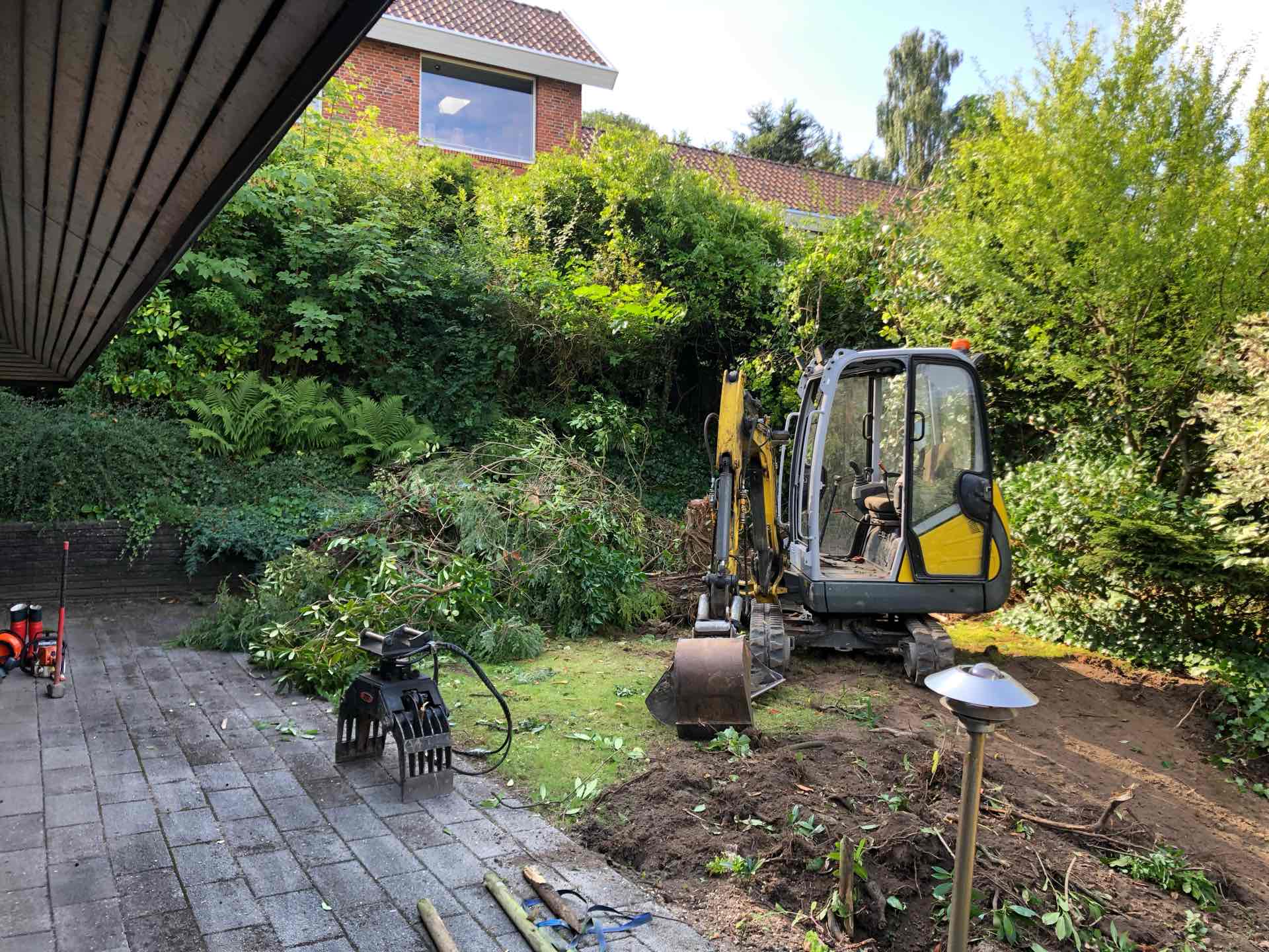 Haven blev ryddet for træer og buske, gamle støttemure og belægninger fjernet, så opbygning af nye støttemure, nye trappeforløb og ny belægning kunne gå i gang.